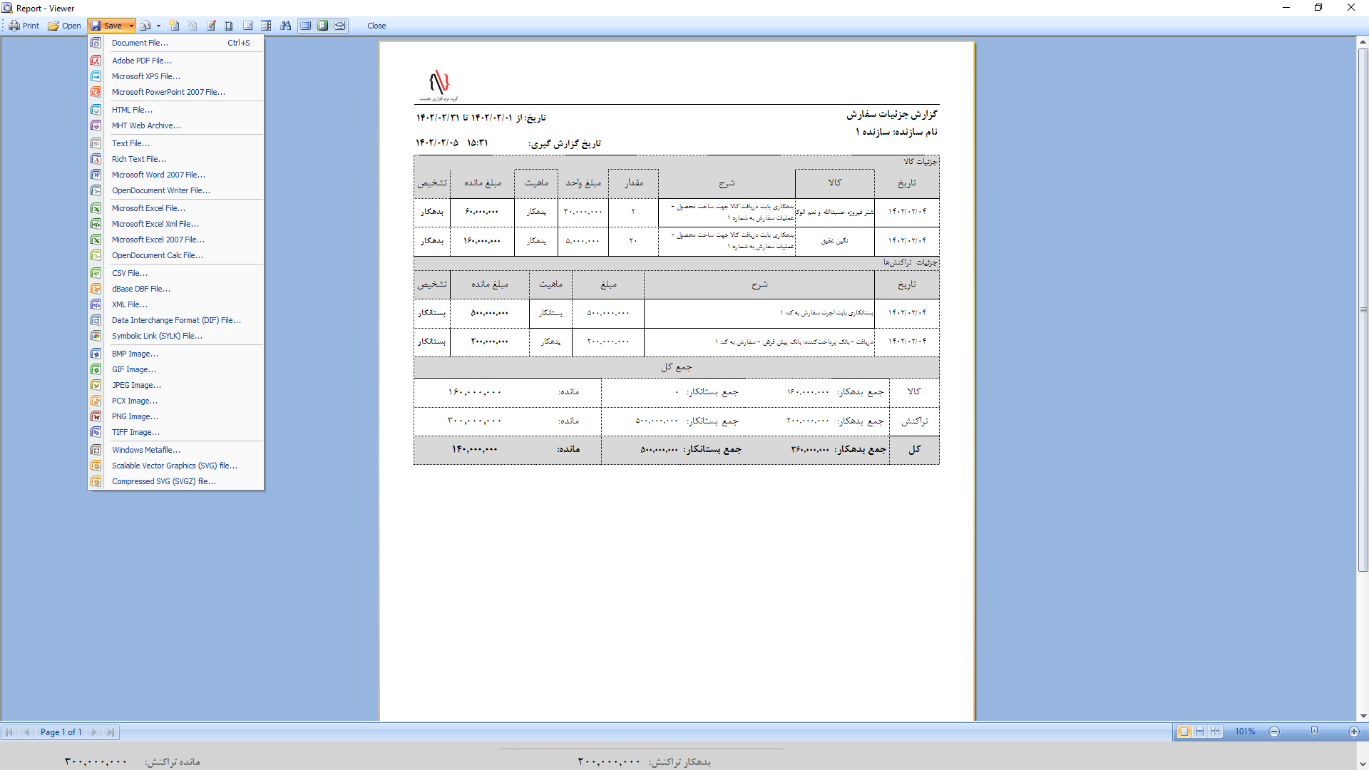 3. خروجیهای نرم افزار: نرم افزار جمعاً 4 خروجی دارد: الف) صورت حساب بانک ب) صورت حساب اشخاص ج) صورت حساب جواهرسازی د) گردش حساب کالا(کاردکس)