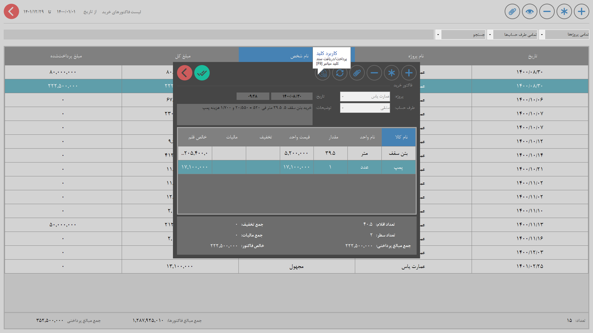 نرم افزار مدیریت پروژه، جهت حسابداری پروژههای ساختمانی طراحی شده تا کاربر به سادگی بتواند وضعیت پروژه از نظر سرمایهگذاری، هزینهها، درآمدها و ... بررسی کند. بسیاری از پیمانکاران ساختمانی در حسابداری مجموعه خود دچار مشکل هستند و در همین مواقع بسیاری از تراکنشها ثبت نشده و پیمانکار تراکنشها را دوباره انجام میدهد چراکه حجم عملیاتها بسیار بالاست. بنابراین نیاز به یک نرم افزار جهت ثبت اطلاعات ضروری است تا پروژه مسیر مالی اشتباه را طی نکند. کاربر باید در این نرم افزار هر پروژه ساختمانی به تفکیک واحدهایی که هرکدام دارند را ثبت کند و در ثبت هزینه، واحدی که هزینه بر آن اعمال شده را مشخص کند. کاربر میتواند هزینههای شخصی خود که از حساب پروژه برداشت نموده است را نیز ثبت نماید.