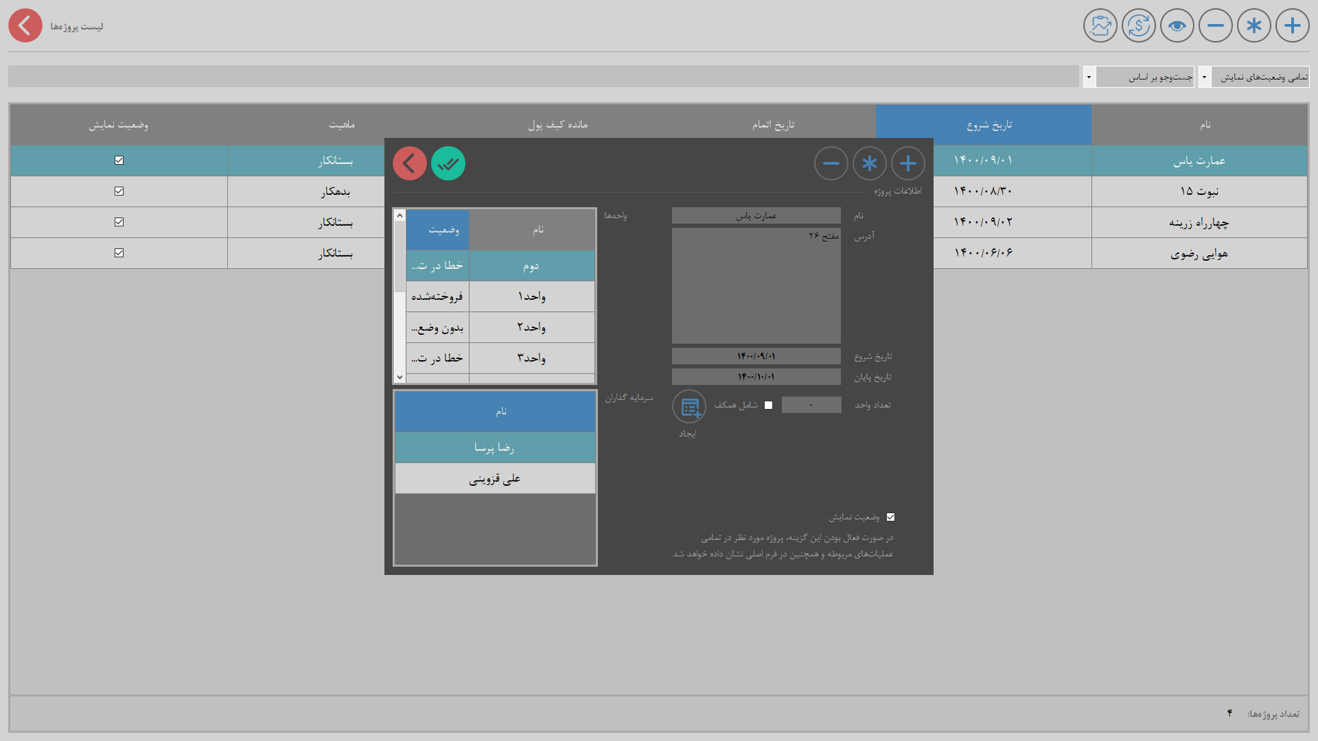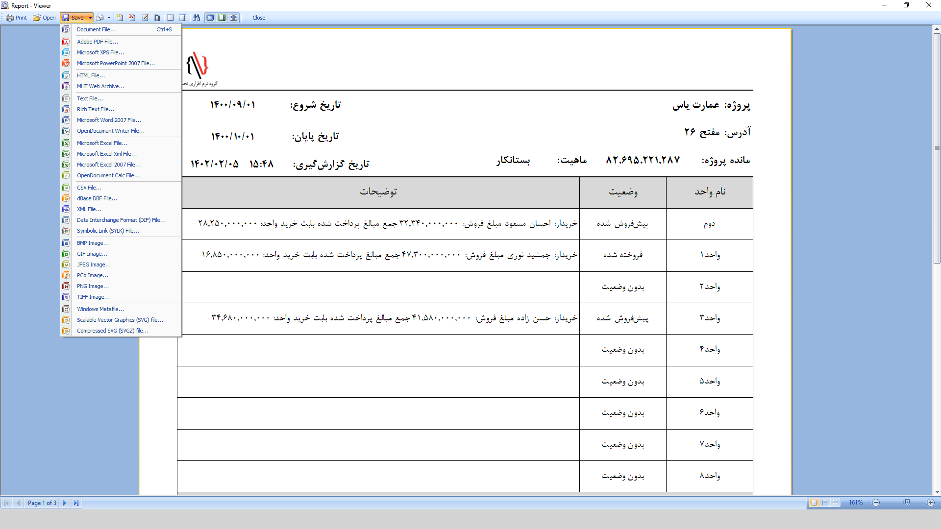 شو گزارشها: این قسمت شامل گزارش گردش مالی پروژه، حساب اشخاص و وضعیت پروژه میشود.