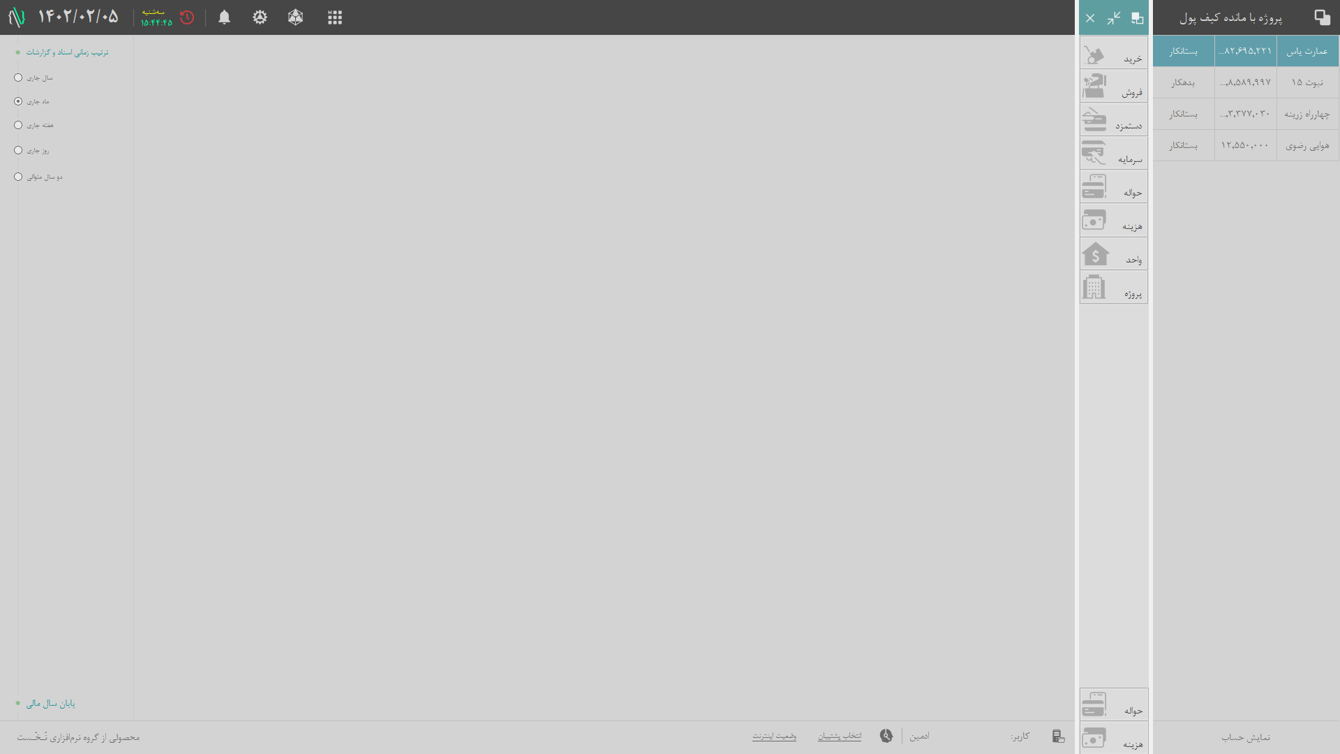 1. اطلاعات پایه: شامل تعاریف اولیه در نرم افزار میشود، همچون: اشخاص، پروژهها، گروههای هزینه، کالاها و ... از این اطلاعات در بخش عملیاتها و خروجیها استفاده میشود