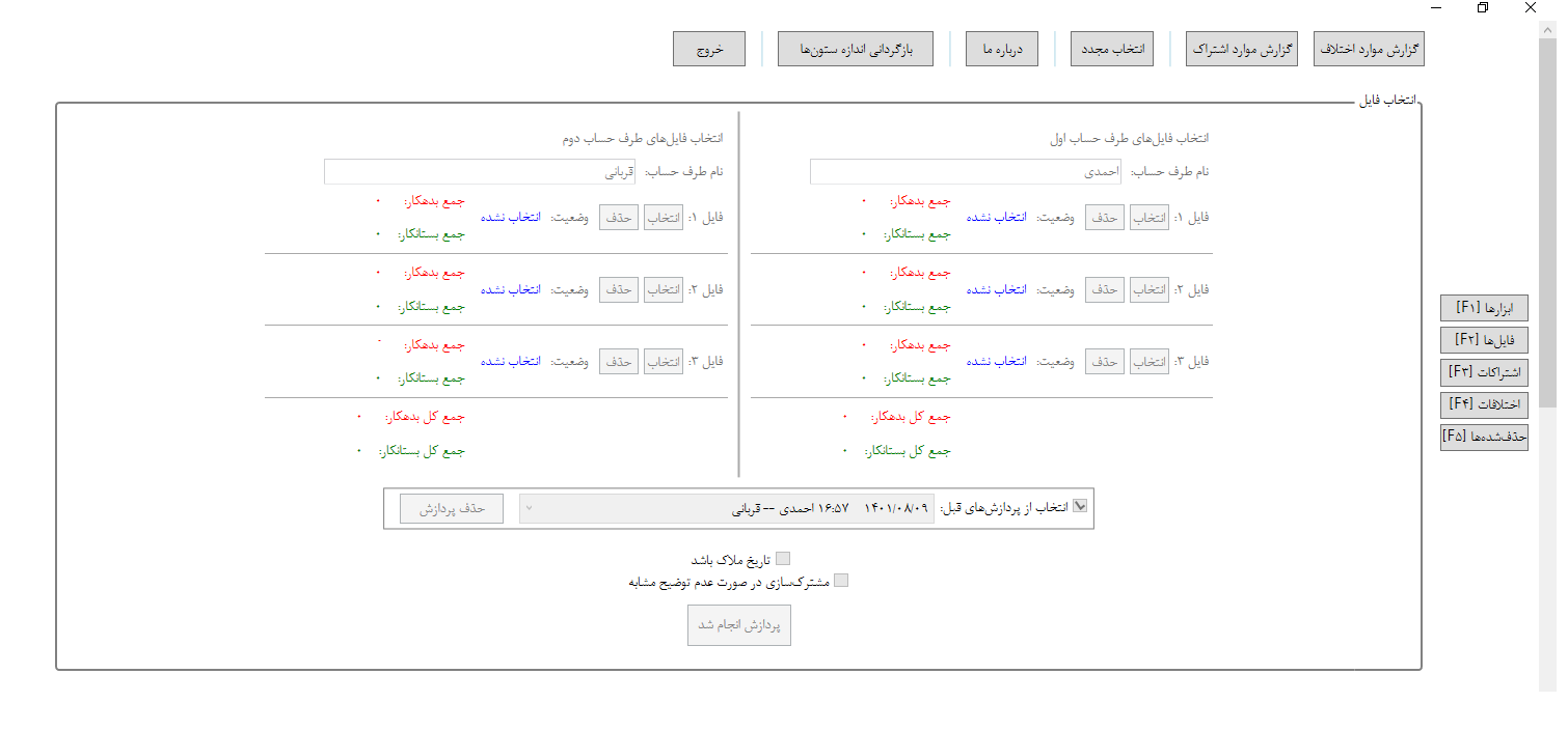 1. قسمت وارد کردن اطلاعات و فایلها: در این قسمت کاربر باید اطلاعات هرکدام از طرف حسابها را وارد نماید. ابتدا نام طرف حساب و سپس انتخاب فایل اکسل برای آن. برای هر طرف حساب کاربر میتواند حداکثر 3 فایل اکسل انتخاب نماید یعنی در حالت حداکثر، نرم افزار باید 6 فایل اکسل را مقایسه کند. البته توجه نمایید نرم افزار فایلهای هر طرف حساب را تجمیع میکند، یعنی در نهایت از هر طرف حساب به 1 فایل واحد میرسد و آن دو را بررسی میکند. به محض وارد کردن فایل اکسل در نرم افزار، جمع مبلغ بدهکار و بستانکار آن نوشته میشود تا کاربر از صحیح بودن فایلی که انتخاب کرده مطمئن شود و همچنین اگر فایل دچار مشکل باشد به کاربر اعلام خواهد شد. همچنین کاربر میتواند کار خود را از پردازش(مغایرتگیری)های قبلی خود ادامه دهد، یعنی با انتخاب گزینه "انتخاب از پردازشهای قبل" میتواند مغایرتگیریهایی که قبلاً انجام داده را مشاهده کند و در صورت نیاز به ویرایش آنها بپردازد.
