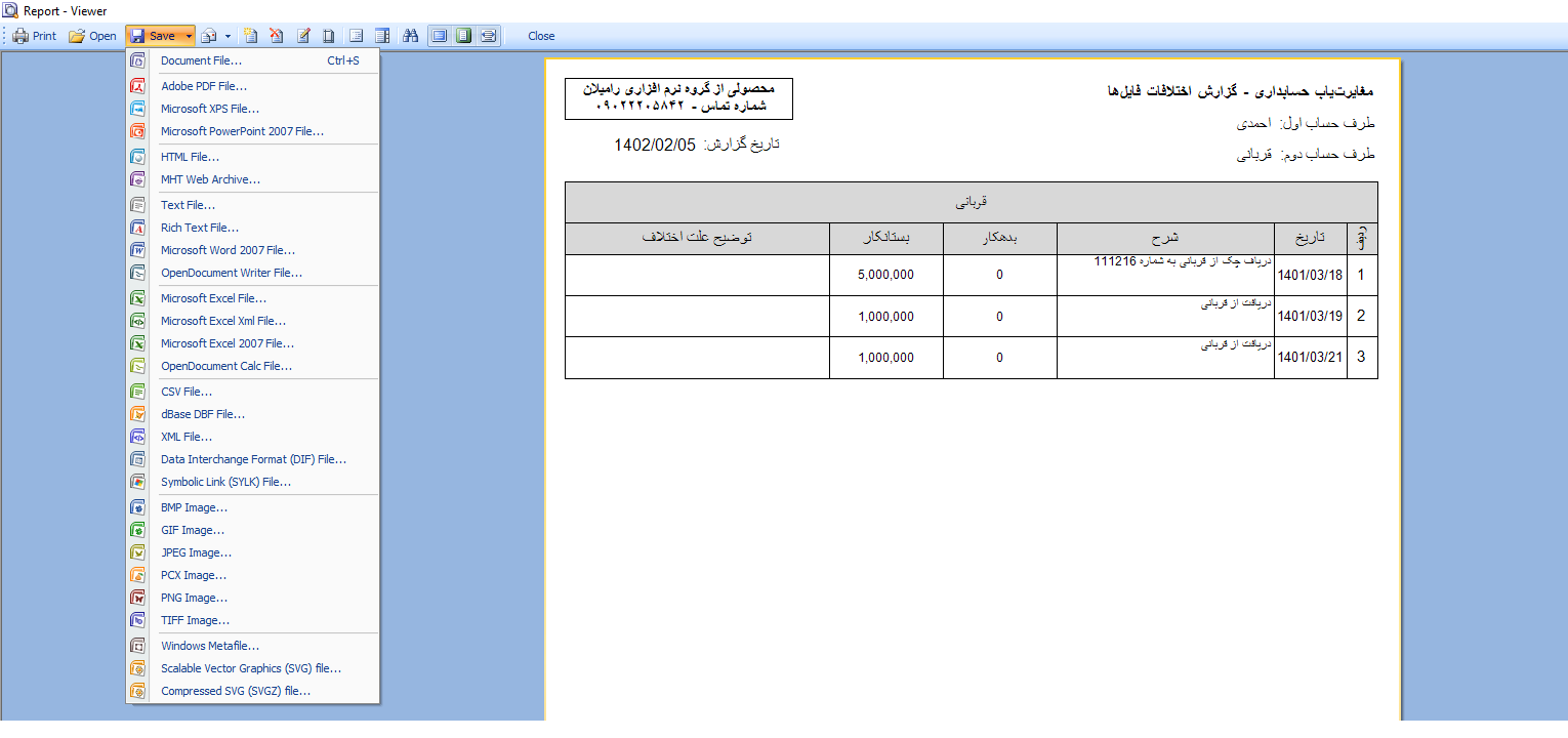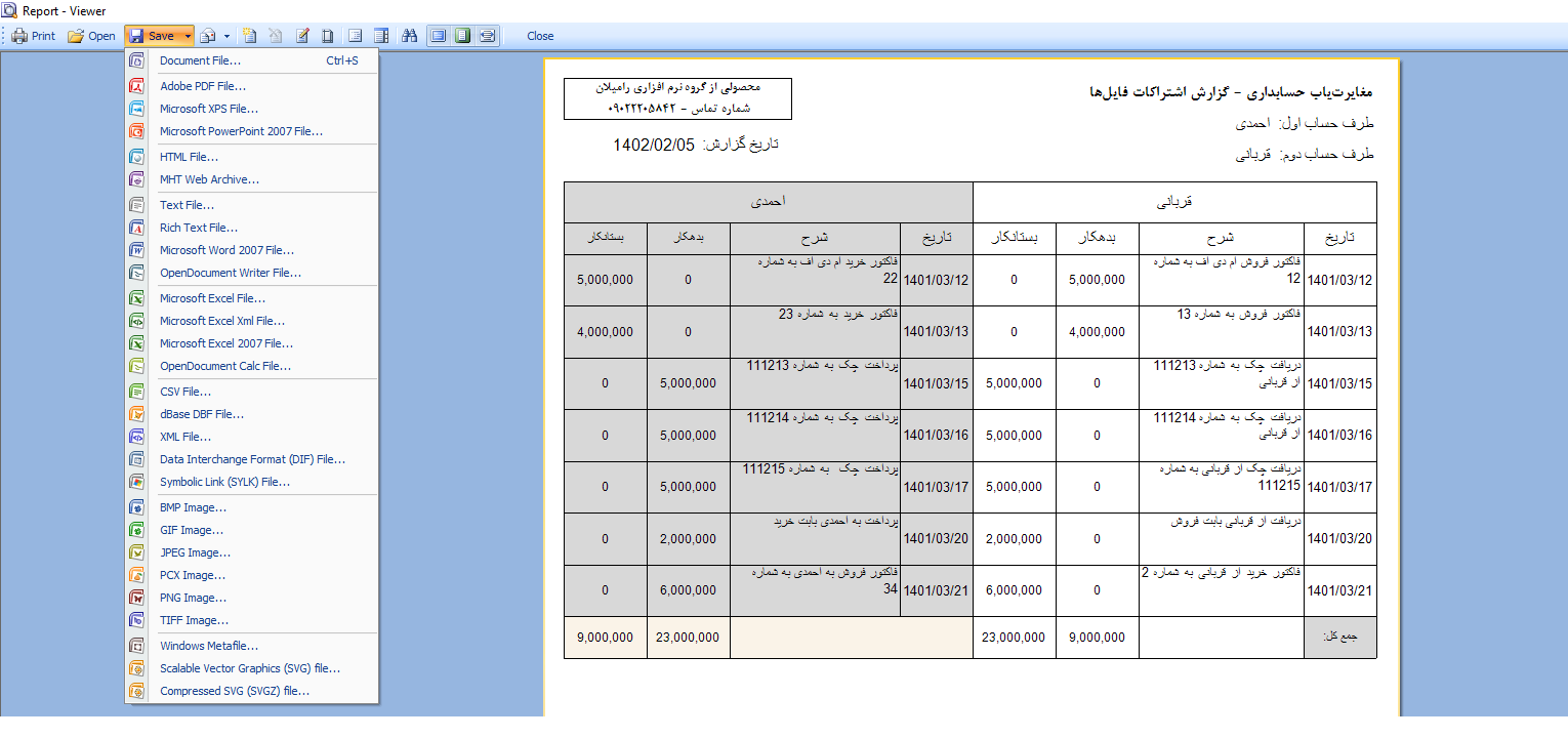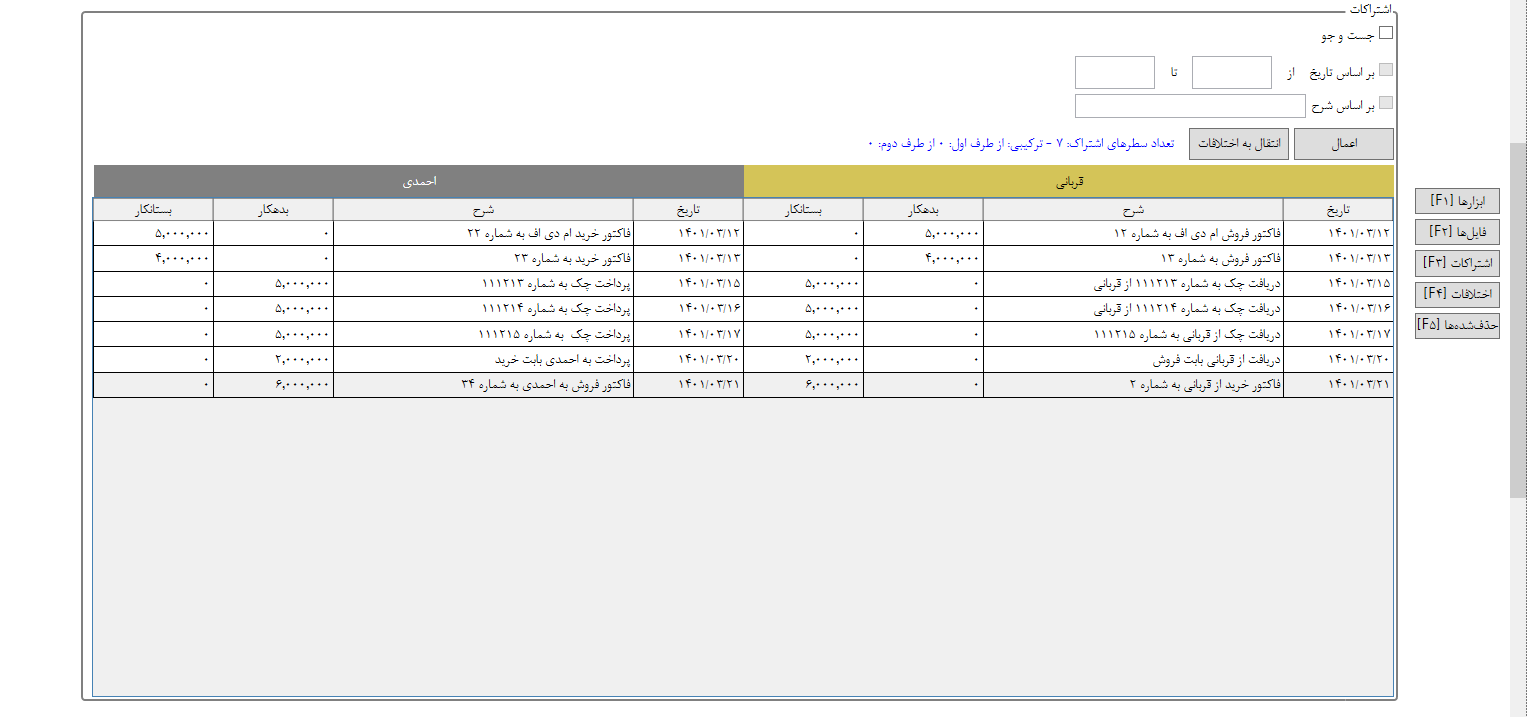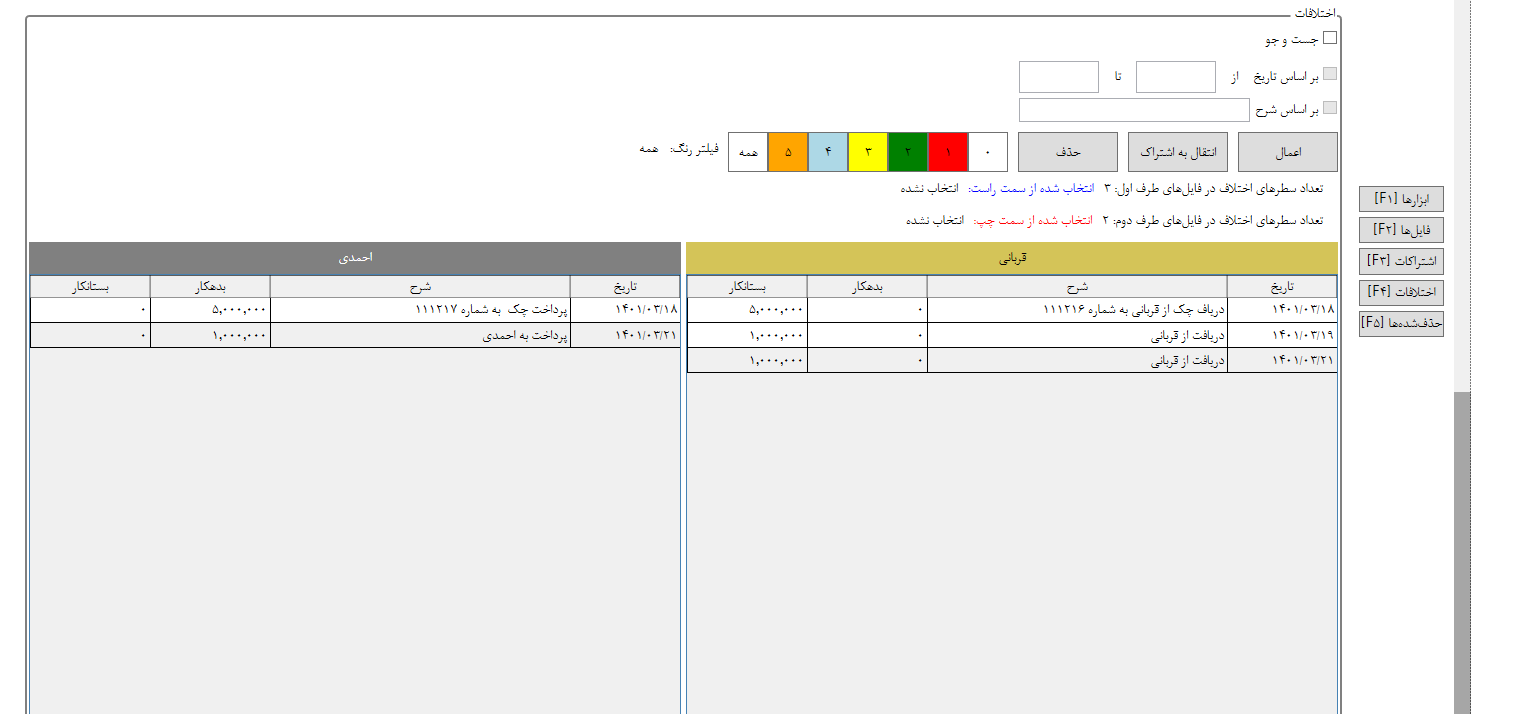 5. قسمت پنل فیلترکردن و انتقال: هرکدام از قسمتهای اشتراکات، اختلافات و موارد حذف شده در بالای خود یک قسمت جهت فیلترکردن اطلاعات و یک سری عملیات پایه را داراست. مثلا در قسمت اشتراکات کاربر میتواند مورد مشترک را از این قسمت حذف و به قسمت اختلافات انتقال دهد که در این صورت هر تراکنش در طرف حساب مربوط به خودش در قسمت اختلافات انتقال پیدا خواهد کرد. فیلترکردن اطلاعات هم با تاریخ و هم با توضیح امکان دارد. در قسمت اختلافات کاربر میتواند چند مورد از یک طرف را با چند مورد از طرف دیگر به صورت یک جا به اشتراکات انتقال دهد و یا از اختلافات حذف کند تا در قسمت موارد حذف شده نمایش داده شود. در پنل مربوط به بخش اختلافات کاربر قادر است هر سطر را به صورت دستی به یک رنگ خاص دربیاورد و در خروجی هم به همان رنگ نمایش داده خواهد شد. این قالبیت به جهت دسته بندی موارد اختلاف تعبیه شده است.