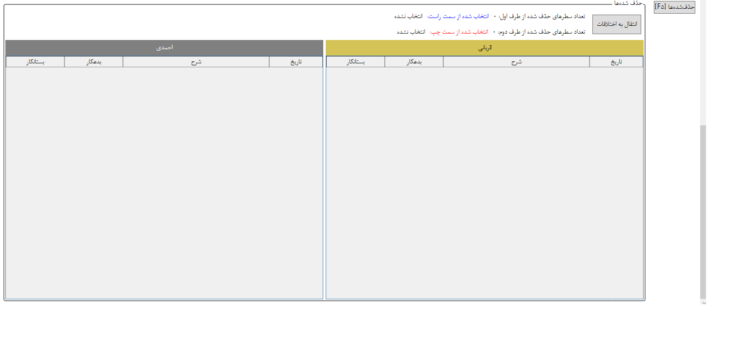 3. قسمت موارد اختلاف: در این قسمت، مواردی از دو طرف حساب که به صورت خودکار پردازش شده و مورد مشابهی برای آن پیدا نشده است را به تفکیک هر طرف حساب میبینیم. یعنی کاربر قادر است مواردی از هر طرف حساب که مشابهی برای آن پیدا نشده است را در همان طرف ببیند و در صورت نیاز به صورت دستی با مواردی از طرف حساب مقابل به اشتراکات انتقال دهد البته به شرط آن که جمع بدهکار و بستانکار، متناظر باشد که در قسمت 5 توضیح داده خواهد شد.